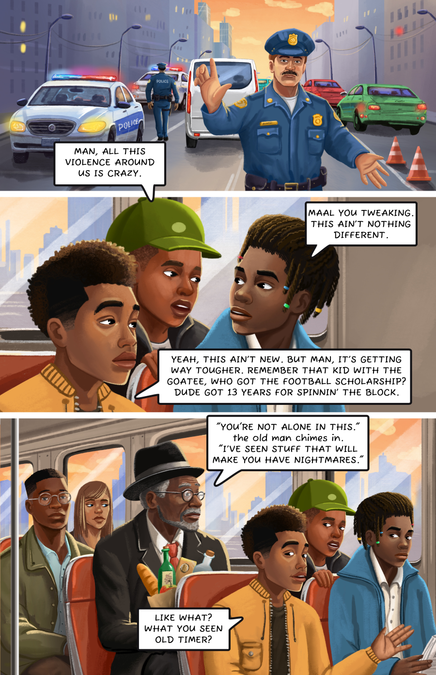 Місто вируює, сирени виють, десь знову хтось сперечається з копом, а автобус трясе по вибоїнах. Звичайний день, нічого нового. Але саме з таких днів народжуються історії. Наша — про те, як одна поїздка може стати цілою життєвою лекцією. Тут немає супергероїв у плащах. Тільки звичайні хлопці, які шукають сенс між зупинками і мріють не запізнитися — не тільки на автобус, але й у цьому житті. Кожен із них — зі своїм минулим, зі своїми шрамами і своїми мемами в телефоні. Хтось скаржиться на все це божевілля навколо, хтось просто робить вигляд, що не помічає. А хтось, на зразок старого дідуся з потертим піджаком, може в двох словах сказати більше, ніж цілий подкаст на Spotify. «Дихай, хлопче. Місто нікуди не дінеться. Закрий очі — але тримай вухо гостро». Ось так і живемо: між зупинками, між нервами і надією. Комікс «Поїздка на автобусі» — це не просто картинки й репліки. Це пульс вулиці, де кожна панель — як кадр з фільму, а кожен персонаж — та сама людина, яку ти зустрічав у своїй маршрутці. Ми показуємо, що за крутими фразами і мемами ховається справжнє — страх, гумор, сила, біль і спосіб не з’їхати з глузду, поки чекаєш зелене світло. Іноді це жорстко, іноді — смішно, а іноді — до мурашок, коли старий розповідає, як мрія може зникнути на перехресті разом із чиєюсь долею. Але на кожній сторінці є шанс зрозуміти: усі ми їдемо в одному автобусі. Хтось мовчить, хтось жартує, а хтось просто дивиться у вікно і думає: «Головне — не пропустити свою зупинку». Тож пристібай ремінь (якщо знайдеш, звичайно 😄), сідай зручніше — і поїхали. Це не просто комікс. Це маршрут по життю — зі зупинками «Надія», «Сарказм» і «Душевна розмова». «Поїздка на автобусі» — проєкт про місто, людей і те, як не втратити людяність, навіть коли маршрут непередбачуваний.