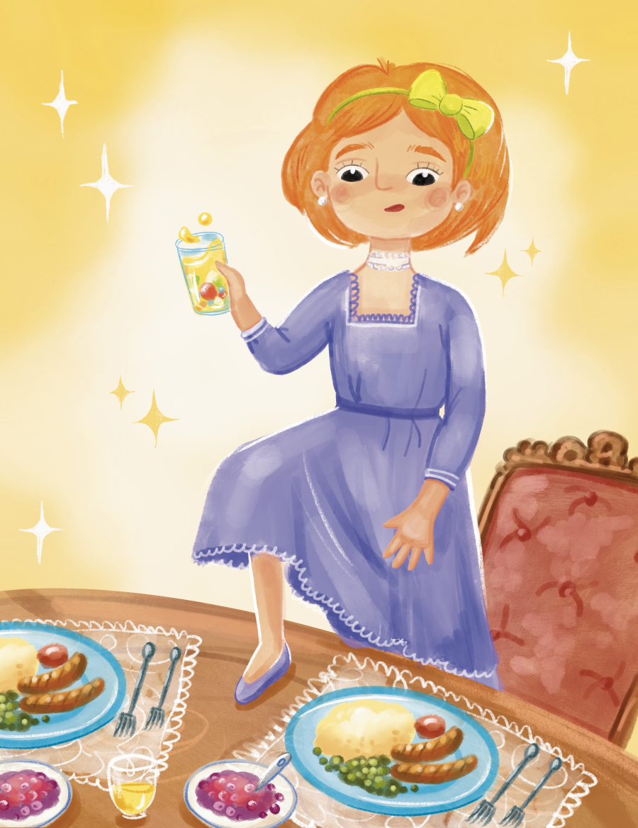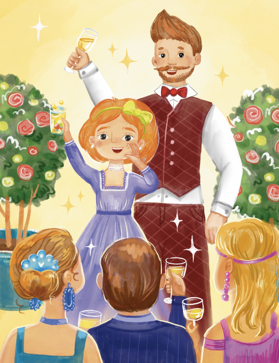 Кульмінацією історії стає святковий момент, коли дівчинка, надихнувшись бабусиними словами, виголошує свій перший тост перед усіма гостями — щиро, по-дитячому і від серця.