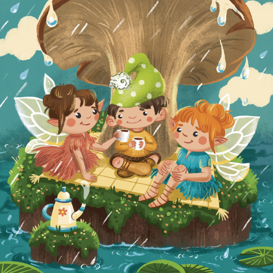 У центрі оповіді — маленький гномик, для якого кожен день стає новим відкриттям. Сьогодні він вирушає у свою улюблену мандрівку лісом. Коли починається дощ, гном знаходить затишний притулок під великим грибом, де на нього вже чекають феї з ароматним чаєм. Разом вони гріються, сміються й слухають тихе постукування краплин по капелюшку гриба.
