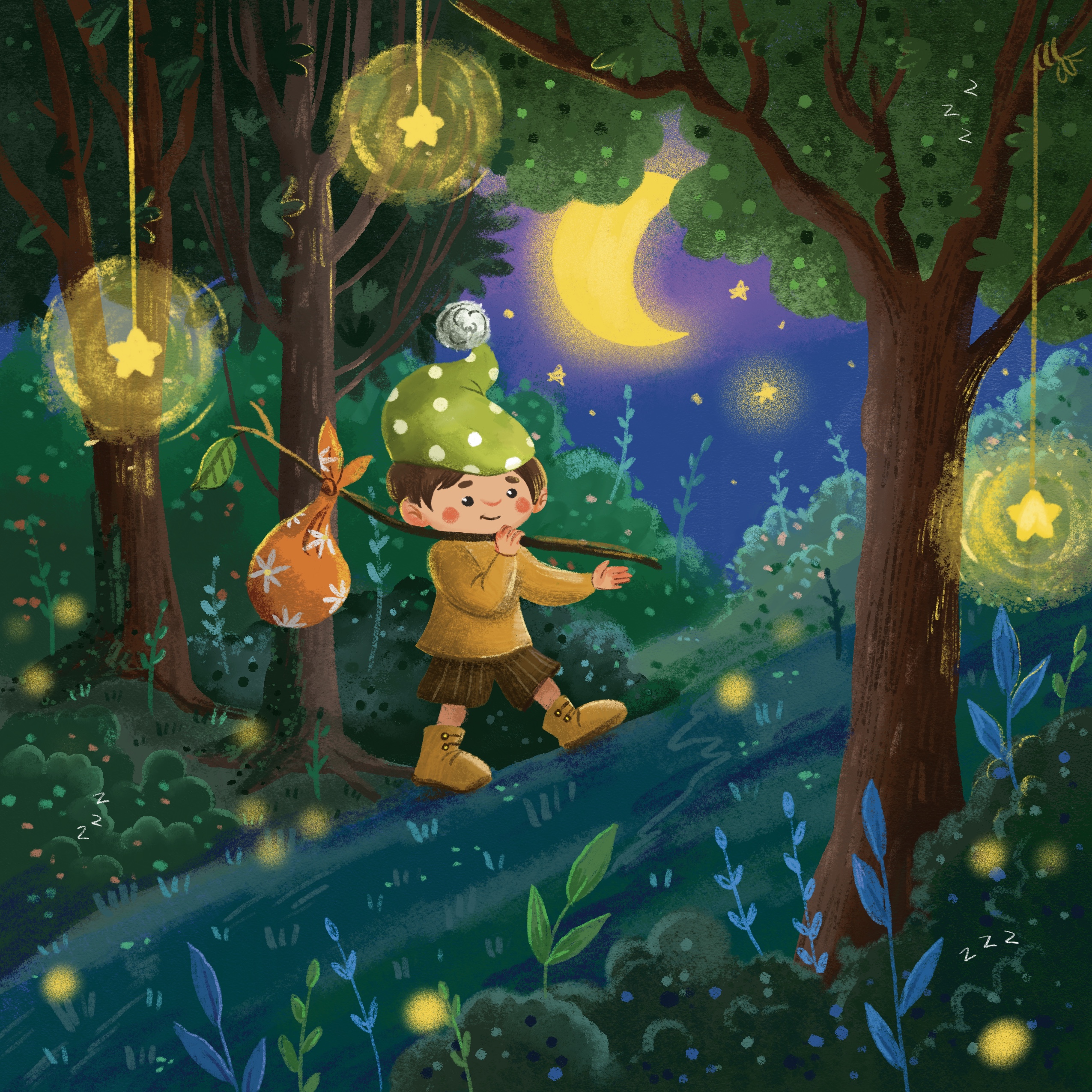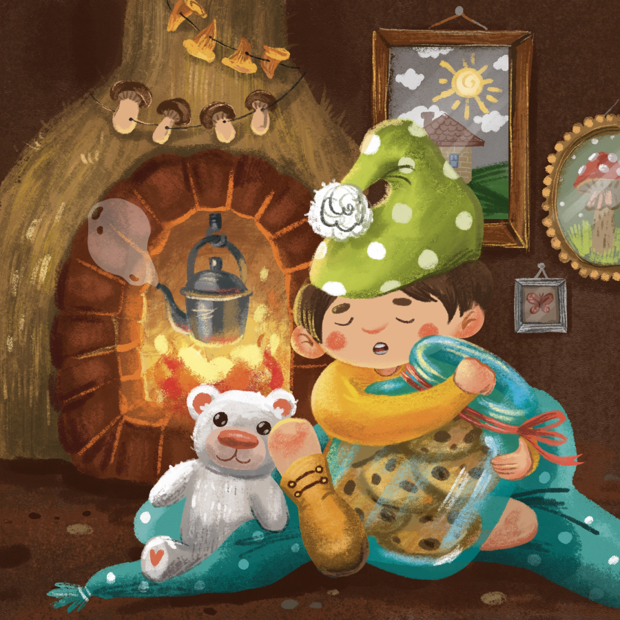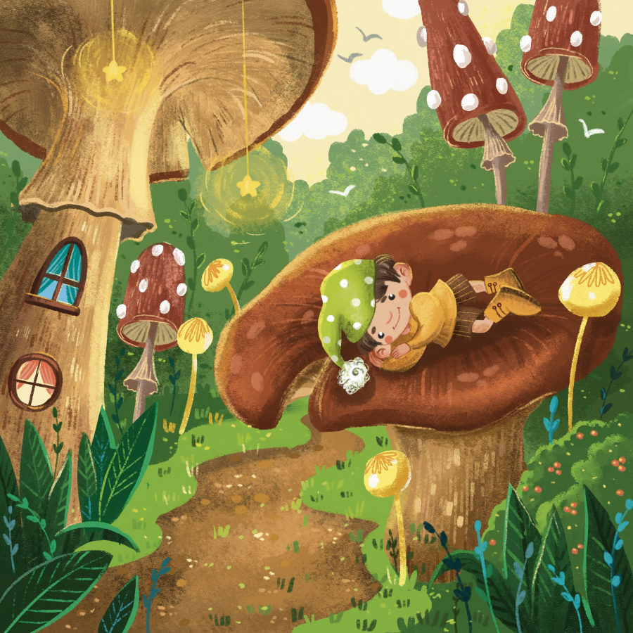 Коли сонце сідає, гномик повертається до свого теплого будиночка. Втомлений, але щасливий, він з’їдає кілька печив, вкривається м’якою ковдрою та солодко засинає, знаючи, що завтра принесе нові казкові пригоди.